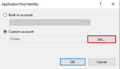 - In the window that opens, you will see ‘Custom account’. The current application pool user will be displayed here. Press ‘Set…’.