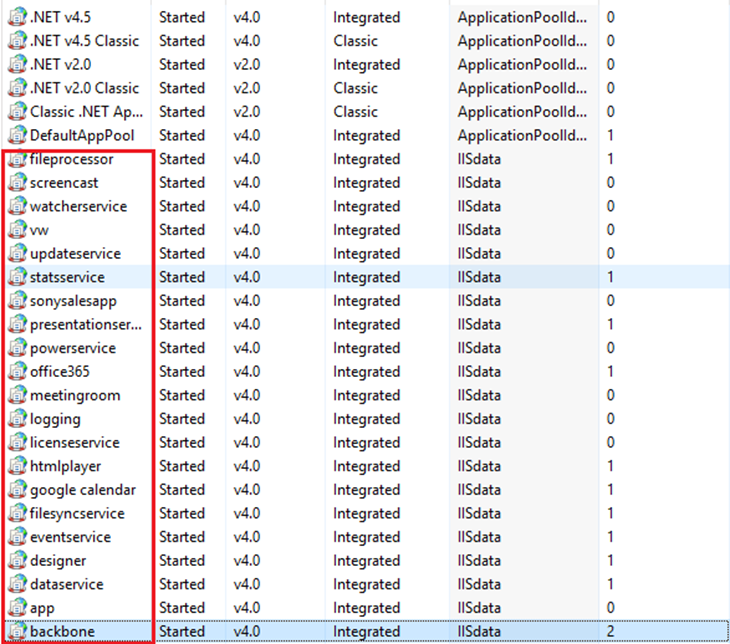 - When this is done, go back to the application pools and repeat the same process for every application pool marked in the screenshot below.