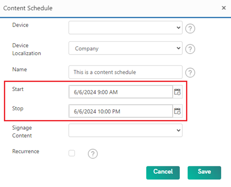 - The next option in this window is the start and end time for the content schedule. Here you can decide on which day and time the scheduled content should start and end.