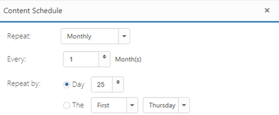 Monthly: With this option, the schedule will repeat every month on a specific day, or on the first, second, third, fourth, or last weekday of the month.