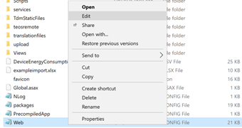 - Once a backup of the file has been made, edit the one located in “Program Files\TEOS Manage\www\backbone”. Right-click the “Web.config” file and select “Edit”.
