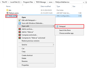 C:\Program Files\TEOS Manage\www\FileSyncWebService - Open the web.config file in Notepad.