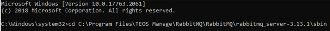 - Open CMD as Administrator and run the command “cd C:\Program Files\TEOS Manage\RabbitMQ\RabbitMQ\rabbitmq_server-3.13.1\sbin”.