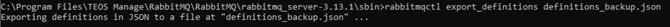 Note that the path can differ based on the location of TEOS and the RabbitMQ version installed. Adjust the command based on the correct path. - Now run the command “rabbitmqctl export_definitions definitions_backup.json”. This will create a backup of the RabbitMQ data.
