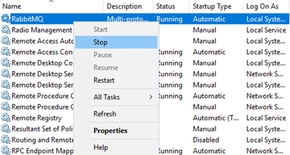 Navigate down to “Downloads on GitHub” and choose the “Windows installer”. - Before installation, the RabbitMQ service needs to be stopped. Open “Services” and stop the service called RabbitMQ.