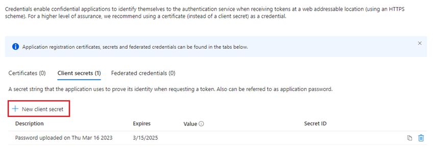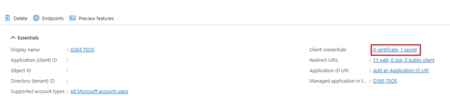 - In the overview, select the blue text next to ‘Client credentials’, which shows ‘x certificate, x secret’.