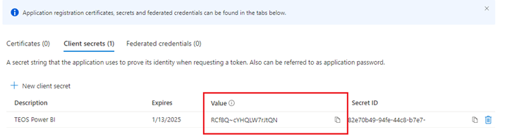 - Once the secret has been added, copy the ‘Value’, as this will only be shown once after creating the secret (the ‘Value’ will be the credential used in TEOS).