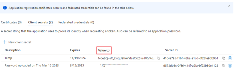 - When the secret is created, you will see the following: Name, Expiration date, Secret ID, and Value. Please copy and store the Value securely, as it will only be visible once.