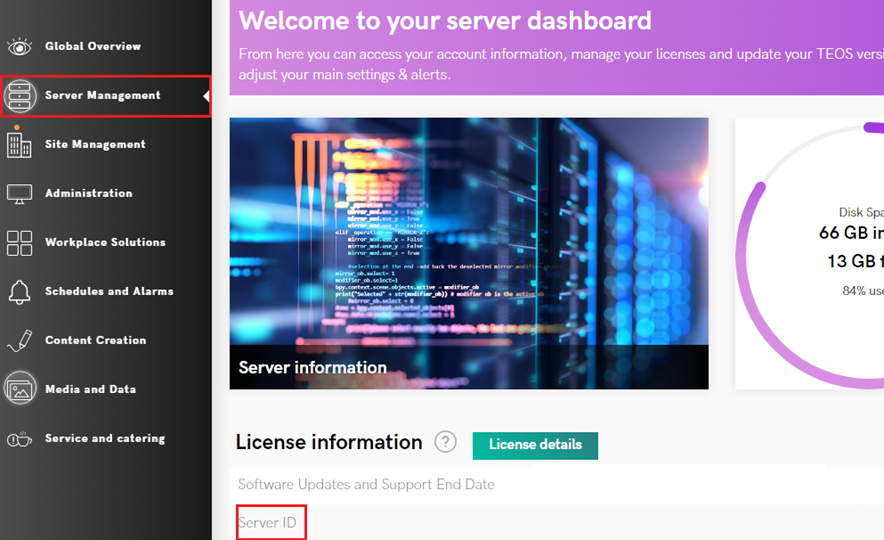 - Enter your Server Licence Key (which can be found on the first order for TEOS) and the Server ID (which can be found on the ‘Server Management’ page in your TEOS web interface).