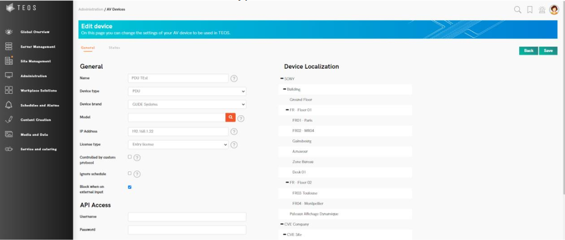 To set this up, create a new device under Administration > AV Device > Add new device and select the type “PDU”.