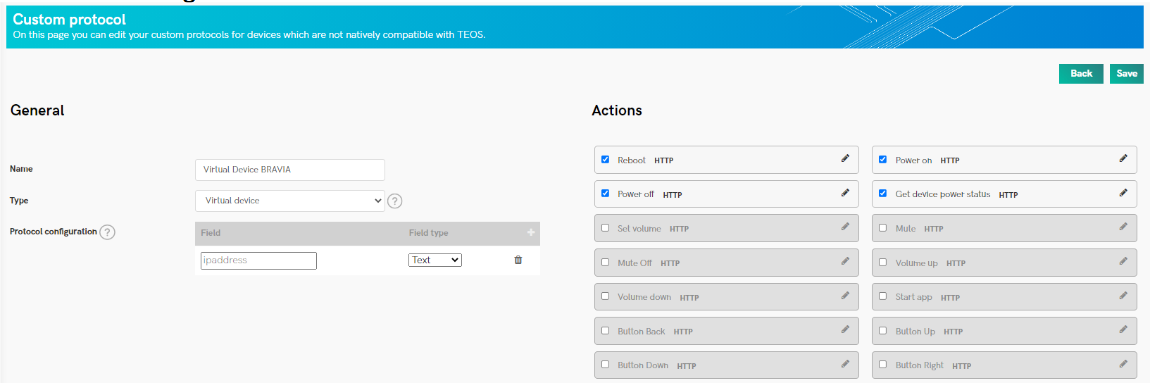 Under “Custom Protocols”, you can add a custom protocol to represent a virtual device (the target in this document) or a custom command. When creating a virtual device, all available actions (set and get commands) are listed on the right side.