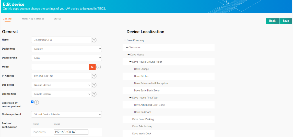 Next, create the device under Administration > AV Devices. Add the device name and IP address, and select “Simple Control” as the license. Enable the “Controlled by Custom Protocol” option and choose the protocol you created. Press “Save”.