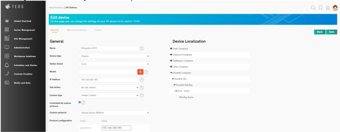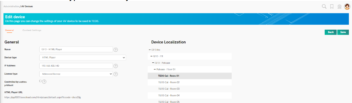- Add the device in TEOS. For signage usage, link the device with a Player.