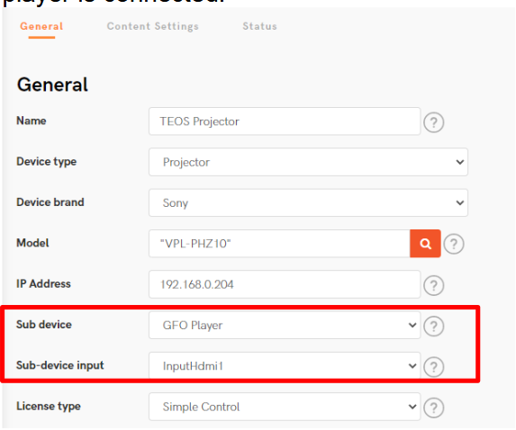 On the TEOS web interface, go to Administration > Device Management, and edit your device. Select the Player you want to link it with, then choose the input where the player is connected.