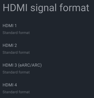 - Select “Inputs > External inputs > HDMI signal format” and set the HDMI inputs in use to “Standard format.”