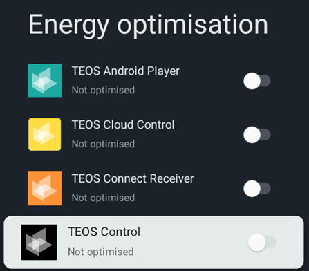- Scroll down until you find the TEOS applications and disable energy optimisation for them.